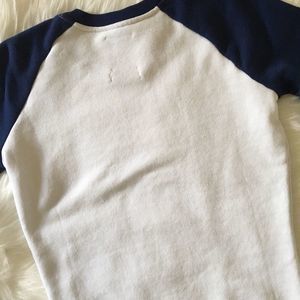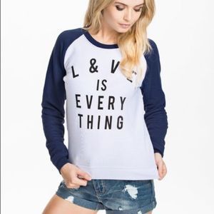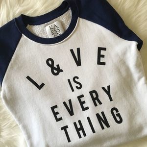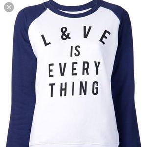 Excellent condition, worn once and hung to dry. Paid full retail price $123. Navy blue and white cotton blend 'Love Everything' sweatshirt from Zoe Karssen featuring a round neck, long sleeves, a ribbed hem and cuffs and a front "L&VE is everything" graphic. 80% Cotton - 20% Polyester. Price is firm, no trades. Smoke and pet free home.