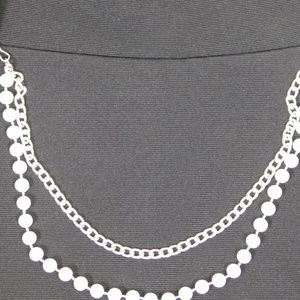 ZOEY BETH pull on stretch knit a-line mini skirt with wide waist belt loops and faux pearl silver chain detail, NOT lined.