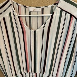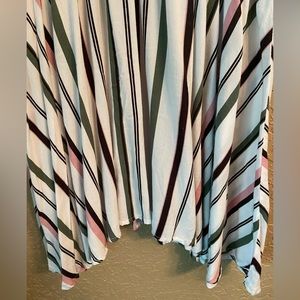 Comfy, Flowy, rounded v-neck with multicolor stripes. Great casual dress.
