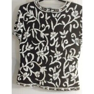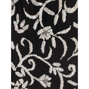 The Zola Evening Silk Beaded Top in size 8 is a stylish and elegant blouse with a floral pattern in black and white. It features a round neck, short sleeves, and classic/fitted sleeve type. Made from silk material, this top is accented with beads and has a regular fit. Additionally, it is lined and has a full zip closure, making it a versatile and sophisticated addition to any woman's wardrobe.