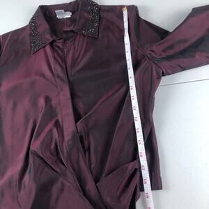 Burgundy with a iridescent Sheen , beaded on collar and cuffs , eye hook and button closure, ties in front , elastic waistband