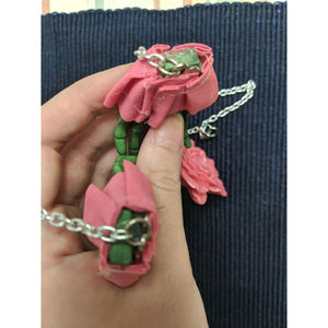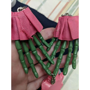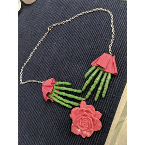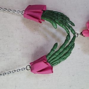 Green skeleton hands with pink cuffs made out of fabric, pink rose dangling under the bony hands. Handmade. OOAK. Creepy, spooky, gothy. y2k style statement piece.