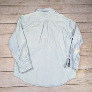 Vintage Western-style shirt with unique Southwestern flair. This light blue button-up features decorative embroidery across the chest and on the pocket flaps, with an Aztec-inspired pattern. Yes there are bleach stains and yes I think you should add more! Some loose bead strings.