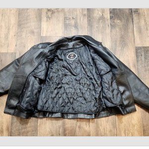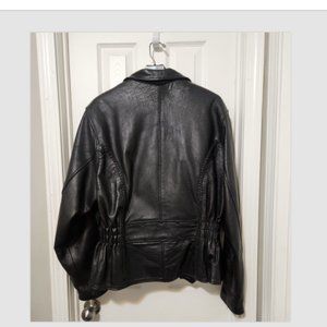 Vintage Zony Inc Black Leather Biker Motorcycle Riding Jacket with Zip Out removeable Lining Women's size 4XL on size tag (49" bust actual). See all measurements. Stretchy waist for comfort and fit. Stud accents on back of waist. Leather braid accent details. Zip pockets.Cuffs zipper.