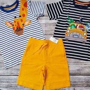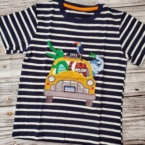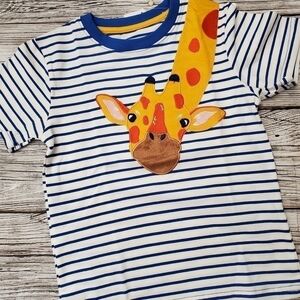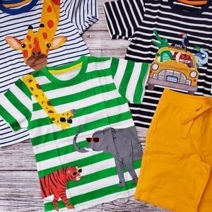 The t-shirts are made of very soft cotton, like that of Hanna Andersson and Mini Boden and feature beautiful appliques with embroidery. The green striped t-shirt features an all-over print.