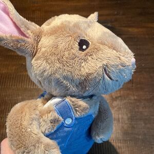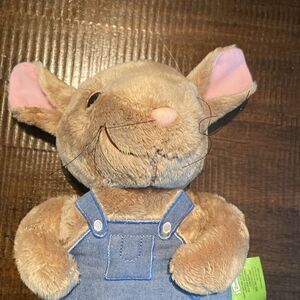 Adorable brown plush mouse toy wearing blue overalls. Soft book.