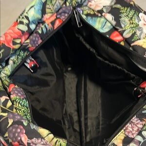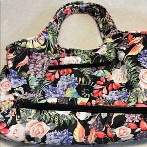 This chic tote bag showcases a romantic floral print on a quilted black fabric, offering both style and functionality. Its spacious design makes it perfect for everyday use or travel, ensuring you can carry all your essentials with ease. Lots of pockets great condition.