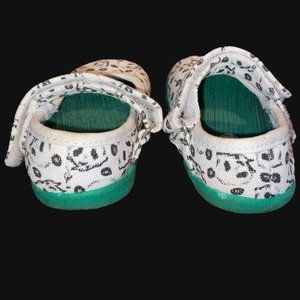 Zooligans Zoo Pop Mary Jane Panda, made with white and black colors (panda) on both the shoe and Velcro hook and loop closure with solid green bottoms. Pre-owned but in great condition. Cushioned and removable insoles.