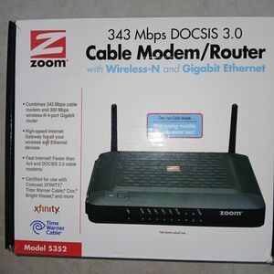Zoom modem router with 343 Mbps speed. Features Wireless-N and Gigabit Ethernet.