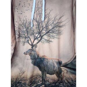 This is a nice pullover hoodie with a graphic print of a deer or reindeer with a tree for the antlers. Shoulder to shoulder measures 19" x pit to pit measures 21" x shoulder to hem measures 26" x sleeve length measures 27.5".