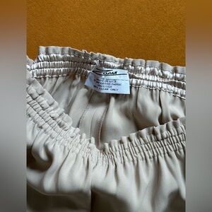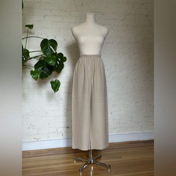 Minimalist beige or light taupe Zoran pant in 100% silk, made in the US. Features a wide leg and elastic waist that measures 12” laying flat (and stretches to 20” laying flat). Many of Zoran’s pieces are notoriously one size, and these pants can accommodate a range of sizes.