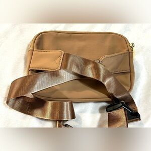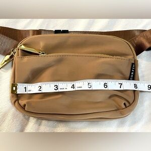 Stylish tan belt bag perfect for everyday use. Features a sleek design with a secure zip closure. See pictures for measurements and additional features. Great for travel or hiking. Like New.