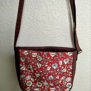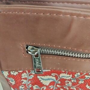 Zouk Purse. Handcrafted, cruelty free and proudly Indian. Bottom of purse has a few small blemishes as seen in photo. Stylish and versatile, this brown and red patterned women's bag is perfect for any occasion. Its unique design adds a touch of elegance to your outfit.