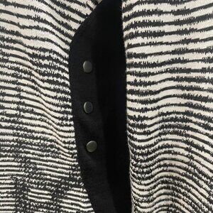 Elevate your wardrobe with this chic ZoZo black and white striped long sleeve sweater in size XL. Featuring a modern striped pattern across the front and unique solid black back, this top combines style and comfort effortlessly. With decorative side buttons and a lightweight knit fabric, it’s perfect for layering in cooler weather. Made from quality materials in China, this versatile piece is ideal for both casual outings and dressed-up occasions.