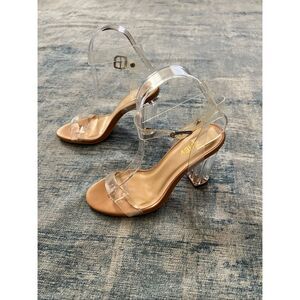 Clear straps over toes and wraps around ankles with a buckle closure. Beige footbed. Clear sturdy block heel approx 4" high (see photo for measurement). Please note; shoe inserts are for display purposes only and are not included with the listing.