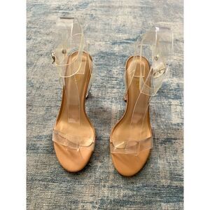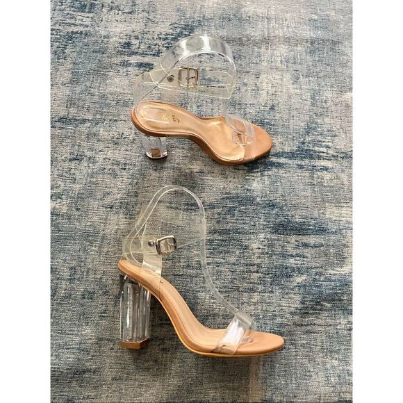 Clear straps over toes and wraps around ankles with a buckle closure. Beige footbed. Clear sturdy block heel approx 4" high (see photo for measurement). Please note; shoe inserts are for display purposes only and are not included with the listing.
