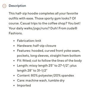 The Zuda Half Zip Jacket in size XS is a stylish activewear piece for women. Made from a comfortable polyester blend knit fabric, this mid-length jacket features a solid blue color and a slim fit. With a pullover closure, long sleeves, hood, and front pocket, this basic jacket by Zuda is perfect for staying active and looking fashionable..3