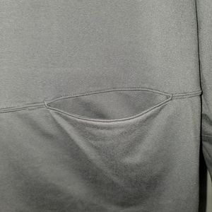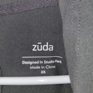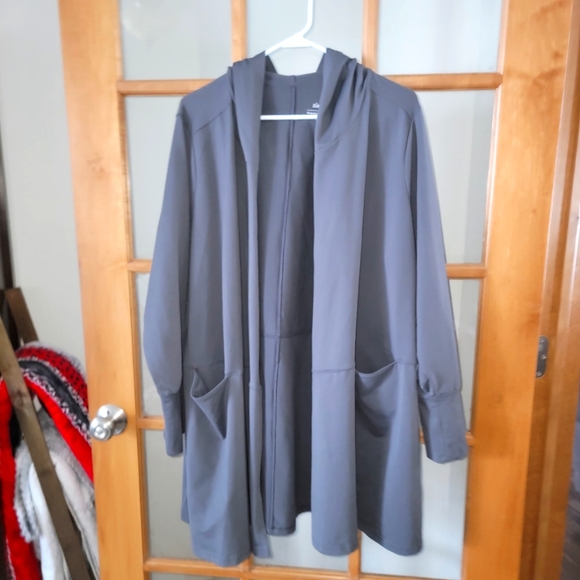 Plus size womens Zuda athletic jacket. Dark gray fabric with a bit of stretch. This jacket will be longer reaching lower hip, hooded, and front pockets. Would make a great casual spring jacket. New without tags