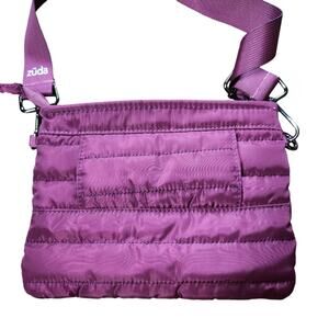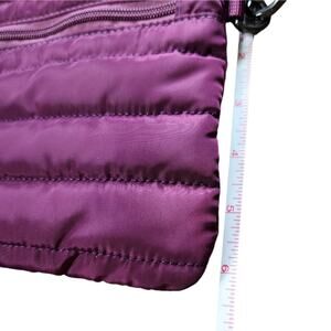 Main entry zip closure, quilted design, front zip pocket, back slip pocket with two ring snaps for belt bag conversion, adjustable webbing strap.