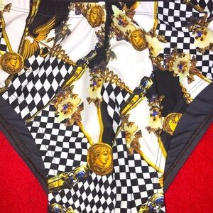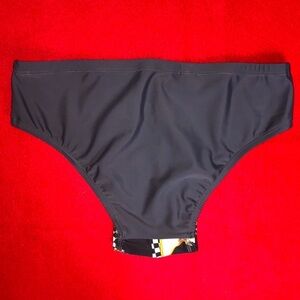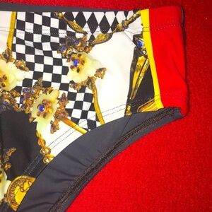 Zuliana Men’s Bikini. Nice and Sexy. Be Unique. Unique front print with solid dark grey back. Exclusive with side band in red and yellow. Elastic Waist.