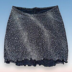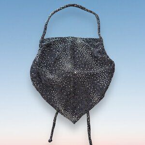 Slinky jet black with sparkly, silver lurex woven glitter throughout the stretchy, clingy fabric. Fully adjustable backless cinch-able bandana halter crop top cami, low to mid rise V-waist mini skirt with a lettuce edge hemline and a matching skimpy, waistline snatching thong bikini bottom.