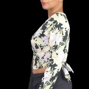 Zulu & Zephyr The Wilds top FEATURES the ability to be worn wrap style with open back or low deep v front. Rouleau ties inside to customize the look with ruched sleeves. Exclusive floral print. Cropped length.