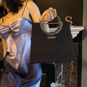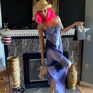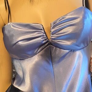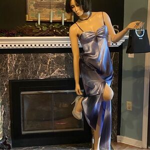 Elegant gown by Zum Zum by Niki Livas. Features a shimmering silver fabric. Perfect for formal events.