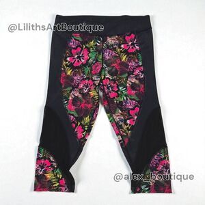 ☆Zumba La Pachanga Mesh Capri Leggings in Shocking Pink. Features bold all-over floral print with solid black panels and sheer mesh insets for breathability. Panels have a sleek "wet look" finish. Capri length with compression fabric for shaping and support, a wide waistband for comfort, and a slim fit.