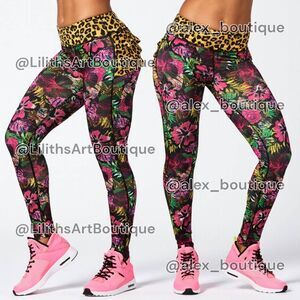 ☆Zumba La Pachanga Ruffle Leggings featuring bold floral print with leopard print waistband. Designed with playful ruffle detail at the back waist, full-length slim fit, and vibrant all-over graphics. Wide waistband, compression fabric 4-way.