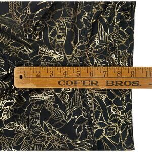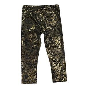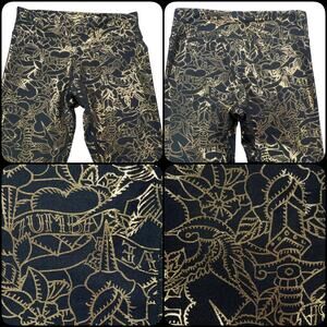 Women's capri leggings from Zumba Fitness. Black pull on leggings with a gold metallic all over floral tattoo inspired print. Mid rise. 4-way stretch for maximum comfort. Style #Z1B00763. 85% Polyester 15% Spandex. Recommend washing in a laundry bag. Due to light & screen variations, colors may vary slightly from the images