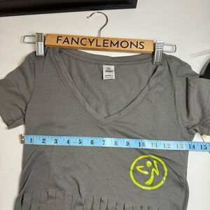 Stand out in your workout with this brand-new with tags (NWT) Zumba Vibrant V-Neck Fringe Top in size Small. This gravel gray top features a deep V-neckline, short sleeves, and bold neon Zumba logo graphics on the front and back. The fringe hemline adds movement and fun, making it perfect for dance workouts, festivals, or a sporty streetwear look.