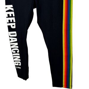 • Vibrant rainbow stripes and "Keep Dancing" print down each leg