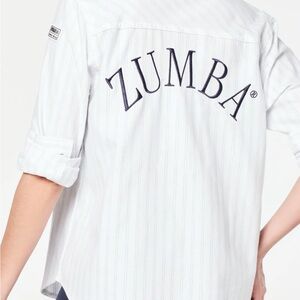 Brand NEW Zumba button down from Hyper Prep Collection. Never worn, tags on & sealed in original packaging. Color white with navy blue embroidered Zumba on.