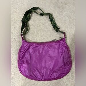 Zumba fitness lot - Zumba Peek-a-Boo cross body bag in purple orchid with camo strap, camo inside and around bottom with zipper. Emblem on front still covered in plastic. Bag is approximately 18 inches wide and 13 inches high