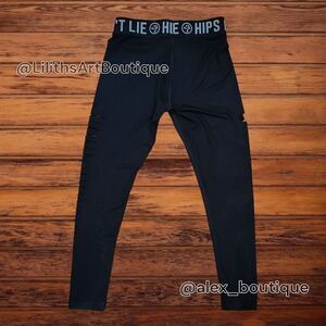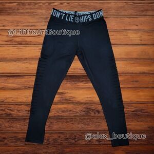 featuring a sleek "wet look" finish, jacquard elastic waistband with "Hips Don't Lie" design, laser-cut slashes down each leg, and ankle length style for a bold, statement fit.