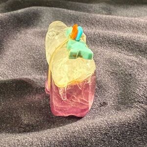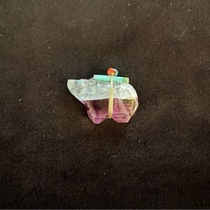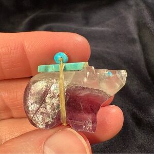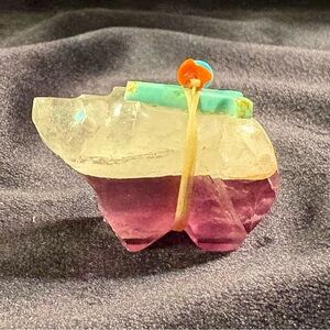 Zuni carved fluorite bear fetish with turquoise detail. Bundle on back features a turquoise arrowhead. Small purple and white fluorite, fluoresces in black light. Measurement in photos.