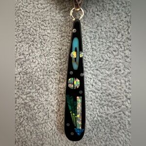 For your consideration is this elegant Zuni Native American pendant, crafted from 925 sterling silver and signed "LU”. It features a striking "galaxy" theme rendered through intricate micro-inlay work on a sleek, elongated black onyx background. The design incorporates various colorful gemstones, including opal and turquoise, to depict celestial elements such as stars, planets, and possibly a shooting star or moon, creating a vibrant and unique night sky scene. The handcrafted piece showcases the meticulous artistry characteristic of Zuni inlay jewelry, resulting in a visually captivating and distinctive pendant.