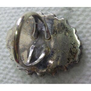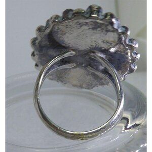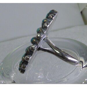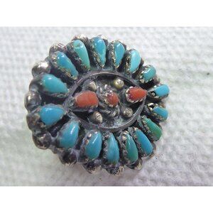 Offered is a Zuni Native American Petit Point Cluster Ring, crafted from silver and featuring a combination of turquoise and coral stones. The ring showcases a striking combination of turquoise and coral stones. The stones are arranged in a cluster formation, with teardrop-shaped turquoise stones encircling a central section that includes a round coral stone and additional teardrop coral stones, all accented with silver beads. This cluster arrangement creates a visually striking and traditional design. This style of intricate stonework is characteristic of the Zuni tribe in New Mexico, who are renowned for their detailed lapidary skills. The term "petit point" refers to the technique of hand-cutting tiny, delicate stones (often pear, oval, or round shapes) and meticulously setting them in individual bezels to create elaborate cluster designs. The ring prominently features blue turquoise and red coral stones, a classic combination found in much Native American jewelry. The stones are set in silver.
