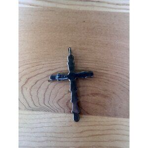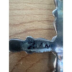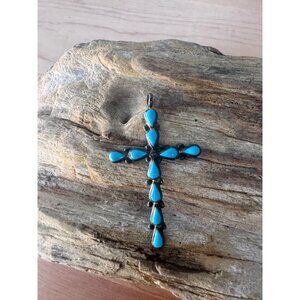 Handmade Zuni Native American cross pendant featuring teardrop-shaped turquoise stones in oxidized sterling silver. The craftsmanship highlights the Zuni tradition of petit point turquoise work, with each bright blue stone individually set. Marked “ZUNI” on the reverse. A striking and meaningful piece of Southwestern artistry.
