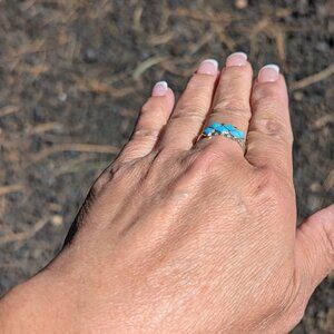 This is a beautiful Zuni handmade mini double layer diamond shape cluster ring. Sterling silver band. Made of turquoise stones Inlay. Elegant and beautiful Southwestern collectible jewelry. This piece was handmade and unsigned by Bonnie Quam, a member of the Zuni Tribe.