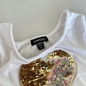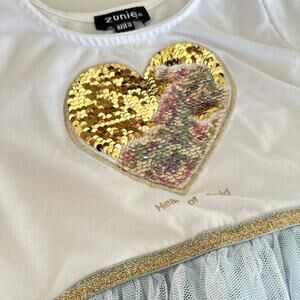 This adorable Zunie dress is perfect for your little sweetheart! It features a beautiful blue tulle overlay adorned with sparkling sequin hearts. The long sleeves make it ideal for cooler weather, and the comfortable fit will keep her happy all day long.