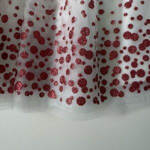 Beautiful Sparkle Christmas Dress with long sleeves with “Sparkle” in silver studs along the front with a white tulle bottom( skirt is fully lined) with red sparkly polka dots. Little Sparkle Bow in Front Waist and Tie Detail in Back finish off the sweet festive look. Perfect for Holiday Season! Excellent condition!