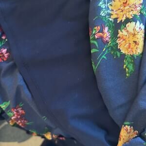 It features a beautiful floral print in fall colors, a sleeveless design, and ruffle details.