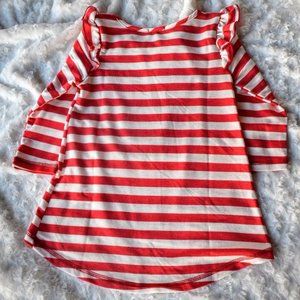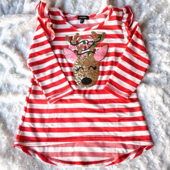Your little star will absolutely adore wearing this Zunie Sequin Reindeer Top this holiday season! Featuring a broad all-over red and cream stripe, this fun and festive shirt displays a delightful sequin reindeer with Christmas lights tangled around its antlers. Shoulder ruffles, a high-low hem, and the stylish swing cut of this tunic top mean they'll not only be fabulous, but comfortable as well. Rayon/poly blend. Shirt is hand wash only. NWOT