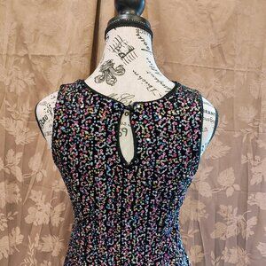 This dress is awesome! It's a black dress covered in rainbow sequin that sparkles when your little one twirls! It's a skater dress silhouette, with a v-neckline and a peek a boo hole on the back and it is perfect for spring and summer. It can be dressed up for events or dressed down for daily wear! Although it is used, there are no stains, holes, or major flaws! Add it to your wardrobe today! We've included pictures from multiple angles to show details and any flaws!