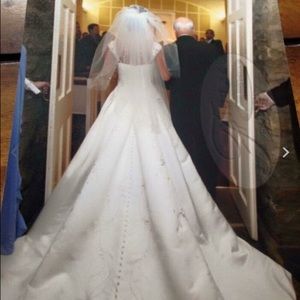 Size 2-4, some alterations... full length with 2-3 foot train, lace cap sleeves, bodice is embroidered and beaded (sleeves are beaded as well), faux button closure hiding zipper closure. Smoke free/pet free home and has been kept in a “bridal keepsake,” box since worn.