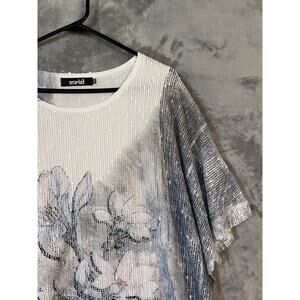 Lovely blouse with flowy mesh-type overlay with built in tank. The design is a magnolia floral with small, subtle sequins to give a bit of sparkle. MEASUREMENTS are in the photos. In very good preowned condition.