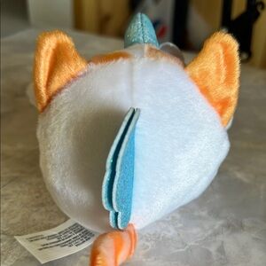 Adorable unicorn cat plush toy in white and orange. Perfect for cat lovers and collectors. Soft and cuddly with a cute bow detail.