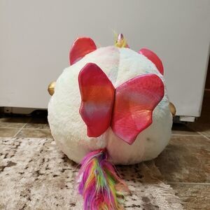 ,Unicorn is 11 inches tall to top of ears and he's in wonderful clean condition! Comes with removeable accessory clip heart that has a fun flippable shakes sequin photo on ones side and all gold on the other. Very cute!!