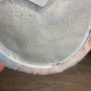 Adorable plush toy with vibrant pink and silver accents. Features a heart detail and colorful fur.